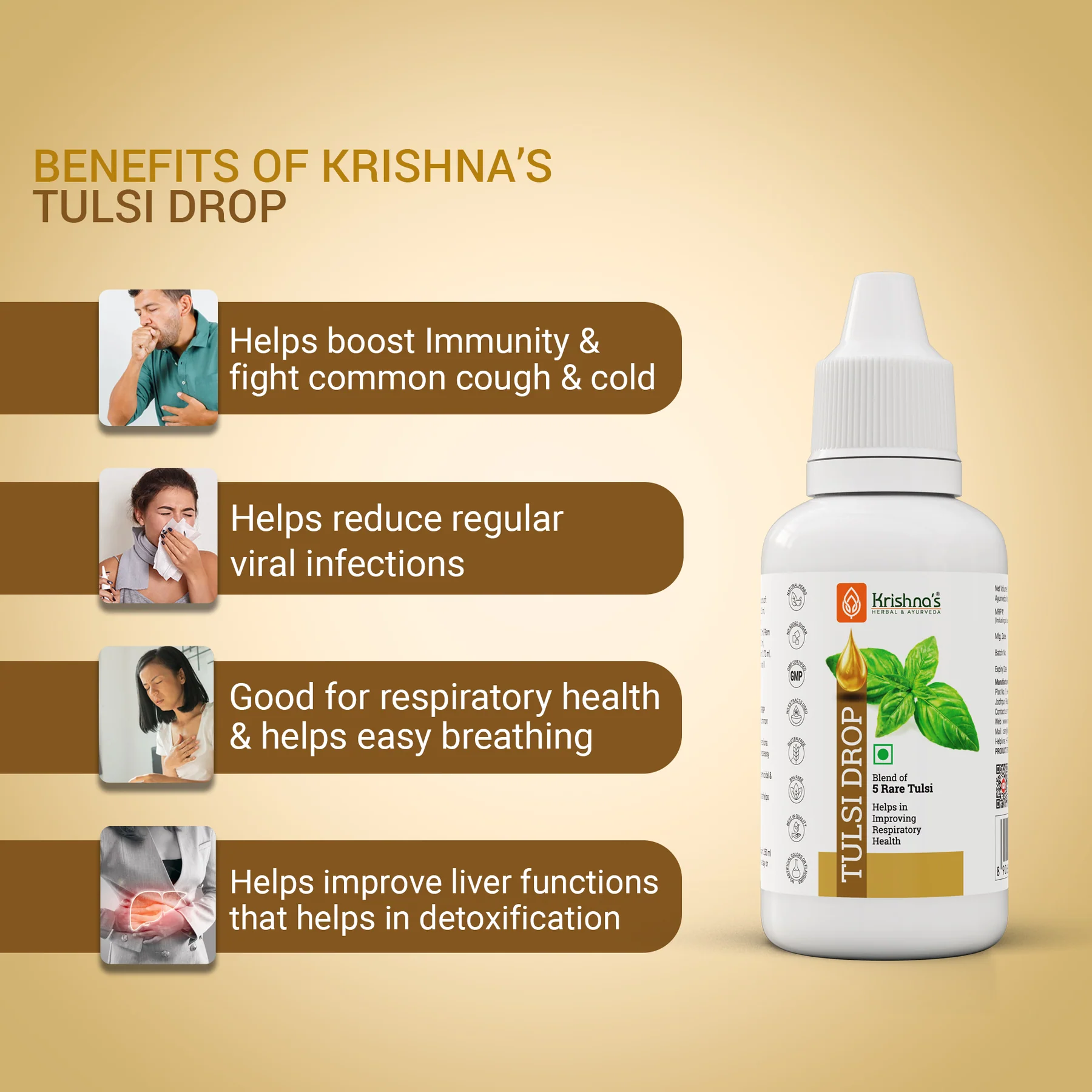 COMMON COLD AND COUGH: Tulsi Drops are a Rich Anti-Oxidant Cleanser, Antiseptic, Antibiotic, and Antimalaria. Tulsi Drops acts as a natural therapy for cough, cold, and flu. It has antimicrobial properties and is good for skin, liver, and joint health.